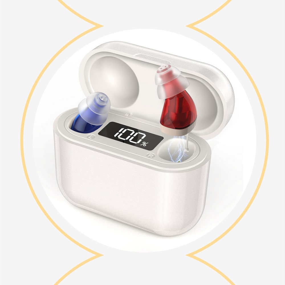 🌟 Stylish and Convenient: Panda® Nano Hearing Aids boasts a unique design, featuring a blue color for the left ear and red for the right, coupled with a sleek, pure white portable charging box. Let your personal style shine through, even with your hearing aids.
